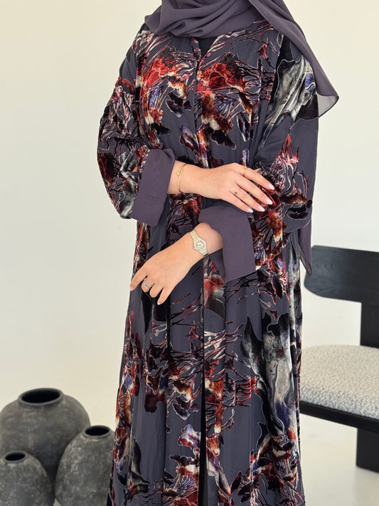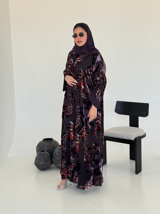 FAB231- Dark Purple Chiffon with Velvet Print Abaya with headscarf