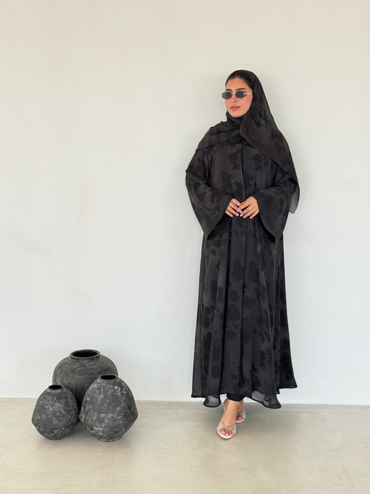 FAB238- Black Floral Silk Jacquard Blazer A-Cut Abaya