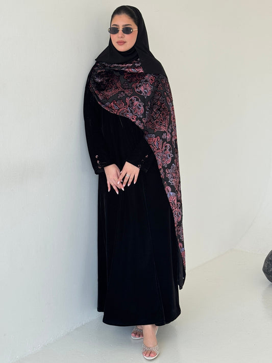 FAB229- Black Velvet Abaya with Maroon Velvet Chiffon Shawl with matching headscarf