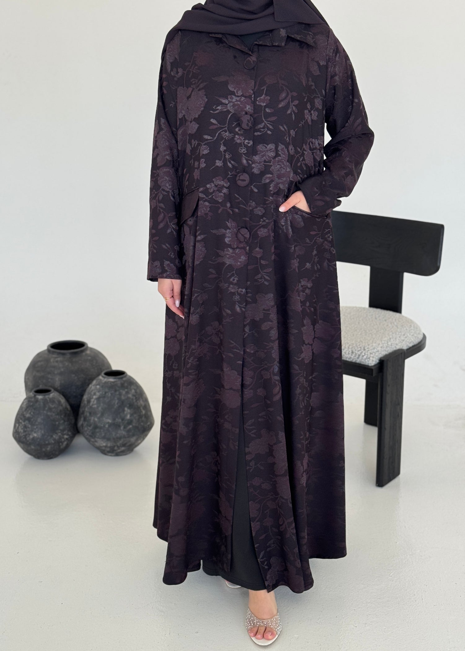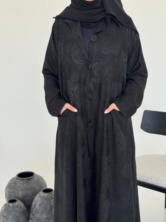 FAB238- Black Floral Silk Jacquard Blazer A-Cut Abaya
