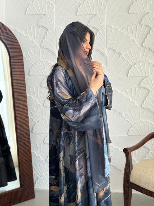 FAB239- Blue Patterned Printed Velvet A-Cut Abaya Set