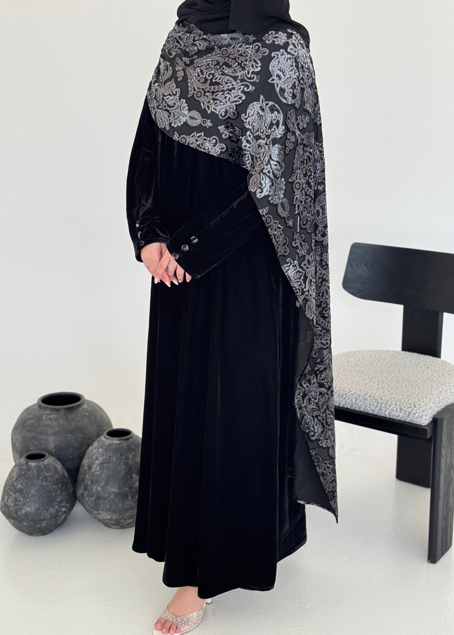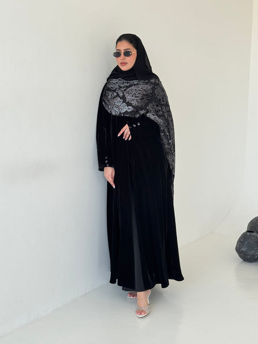 FAB230- Black Velvet Abaya with Grey Velvet Chiffon Shawl with matching headscarf