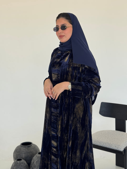 FAB235- Blue & Gold Marble Velvet A-Cut Abaya