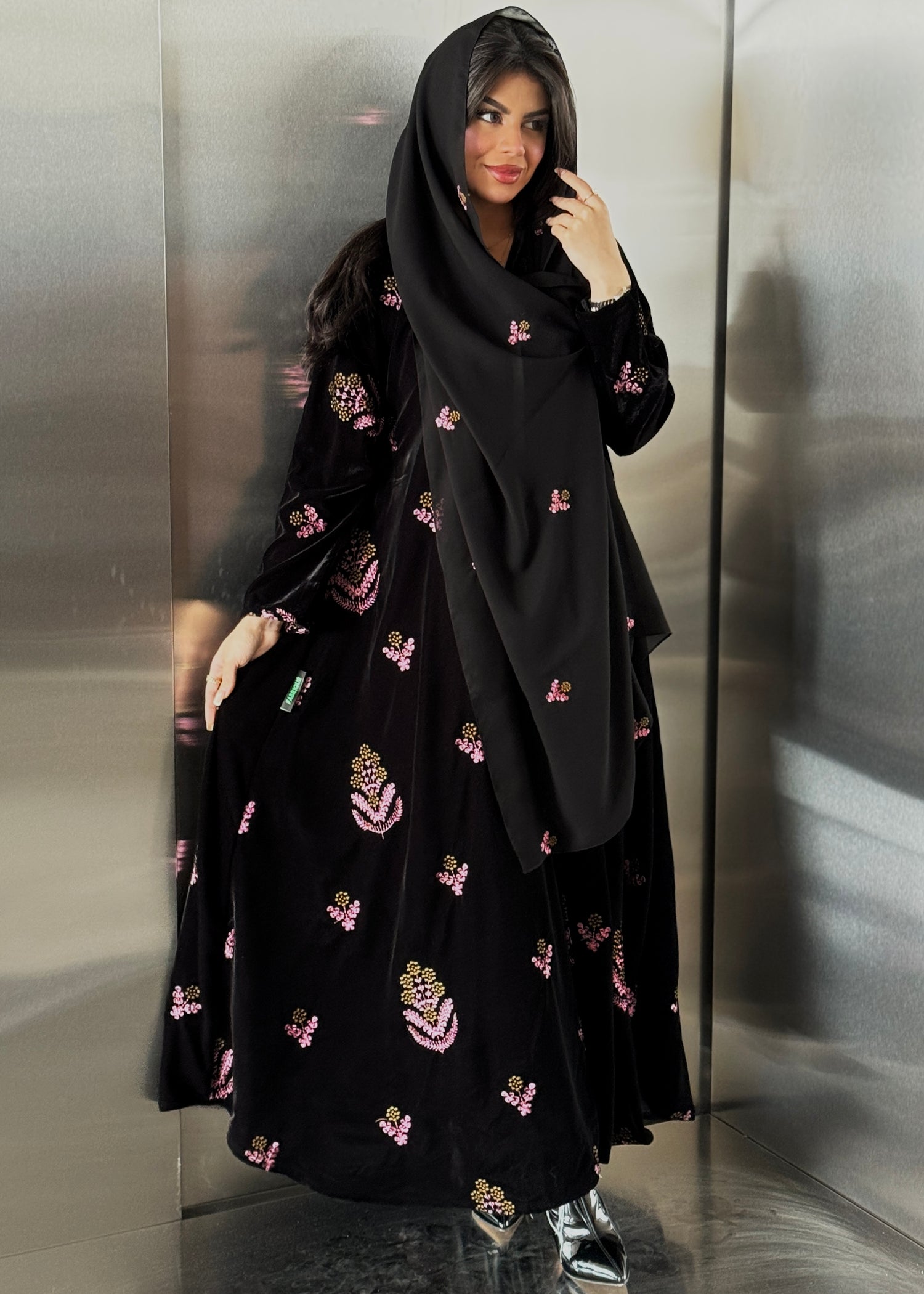 FAB248- Black Velvet with Pink Embroidery A-Cut Abaya Set