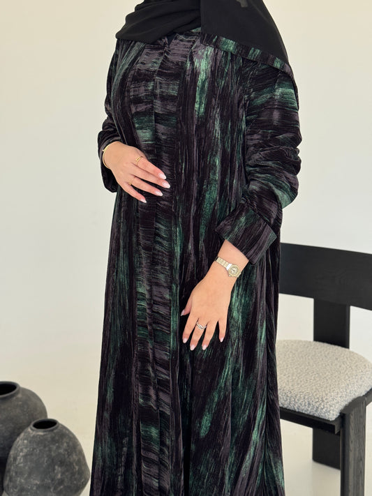 FAB236- Black & Green Marble Velvet A-Cut Abaya