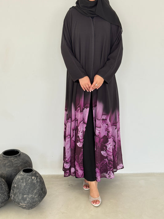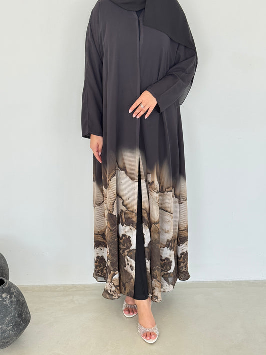 FAB225- Brown Grey Printed Floral A-Cut Abaya
