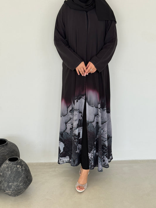 FAB209- Grey Ombre Waves print Shiffon A-cut Abaya with headscarf