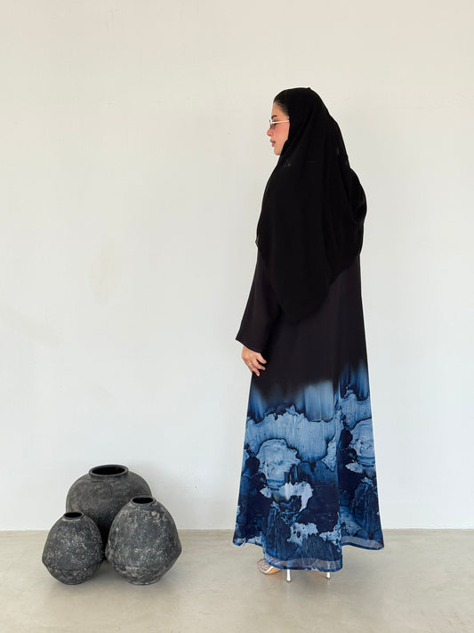 FAB212- Blue Ombre Waves print Shiffon A-cut Abaya with headscarf