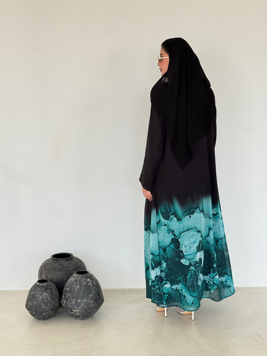 FAB210- Turquoise Ombre Waves print Shiffon A-cut Abaya with headscarf