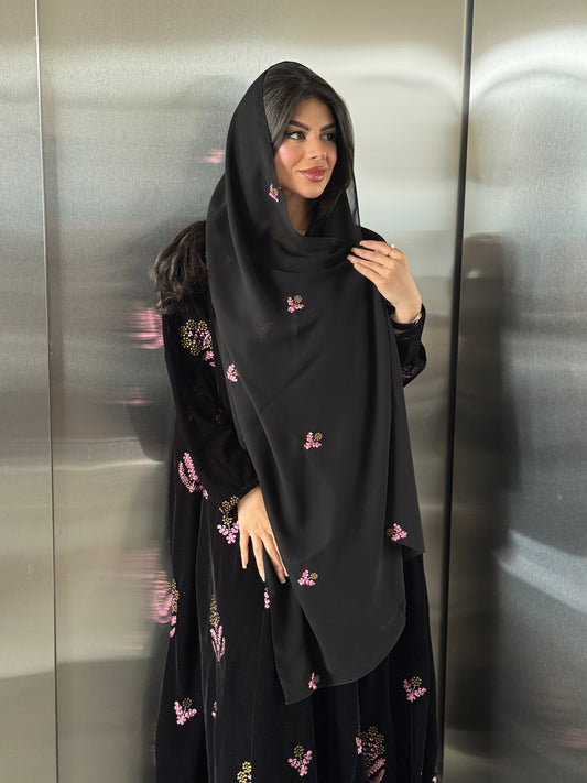 FAB248- Black Velvet with Pink Embroidery A-Cut Abaya Set